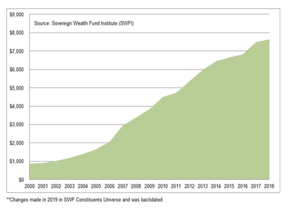 Yang menarik, memasuki tahun 2005, pertumbuhan SWF melesat pesat. Pada tahun 1990, total SWF di dunia mengelola sekitar US$ 500 miliar, pada tahun 2007 jumlahnya telah mencapai US$ 2–3 triliun (Simon 2007). Tidak hanya dari total dana terkelola, jumlah SWF yang ada pun meningkat. Di tahun 2005 tercatat ada 30 SWF di dunia dengan total dana terkelola sekitar US$ 2 triliun, sedangkan di tahun 2018, jumlahnya meningkat menjadi 80 SWF dengan total dana terkelola sekitar US$ 8 triliun (Orchard 2020).