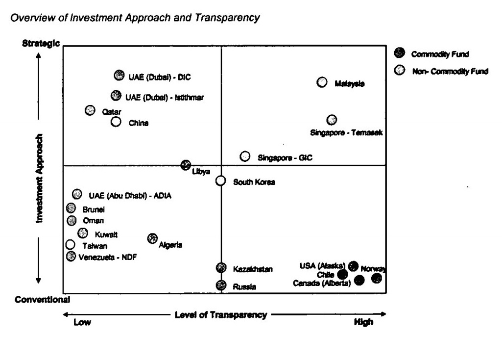 Kendati demikian, gelombang naik SWF berlangsung dalam pola yang kompleks. Naiknya negara-negara non-OECD atau negara-negara non-sekutu tradisional Amerika Serikat hanyalah salah satu tengara dan belum menggambarkan kecenderungan seluruhnya. Sebaliknya, gelombang naik SWF memuat variasi latar belakang negara yang lebih rumit. Untuk memudahkan pemahaman, kita akan kelompokkan mereka dalam tiga klasifikasi negara.