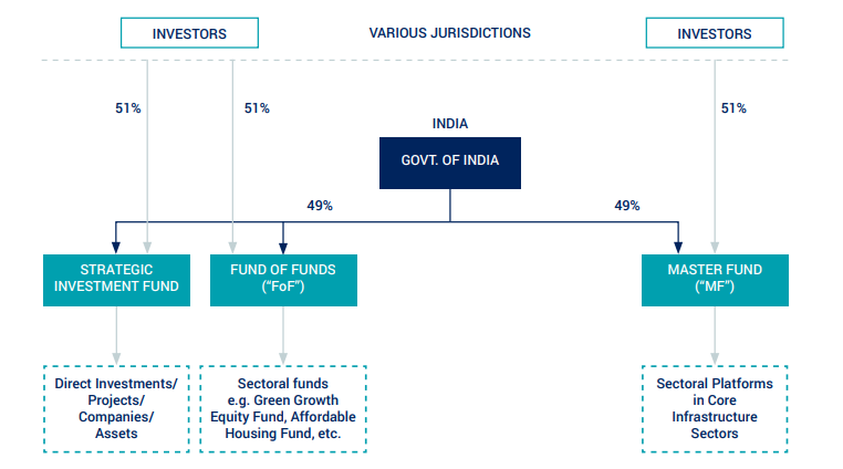 Hingga saat ini, struktur kapital NIIF masih didominasi oleh pemerintah India, dengan persentase 49 persen dari total dana investasi yang ada (GIHub 2019, 75). Sisa dari struktur kapital NIIF terdiversifikasi terhadap investor swasta dari ranah domestik dan asing. Partisipasi sektor asing ini bisa berasal dari investor badan pemerintah, badan swasta, maupun kontribusi individu negara lain. Misalnya saja, Abu Dhabi Investment Authority menjadi investor asing terbesar di NIIF, dengan jumlah investasi mencapai USD 1 milyar (GIHub 2019, 77). SWF negara lain seperti Temasek Foundation dari Singapura juga tercatat memiliki dana di NIIF. Sayangnya, hingga saat ini, salah satu kritik besar NIIF adalah kejelasan terkait sumber dana dari investasi pemerintah India.
